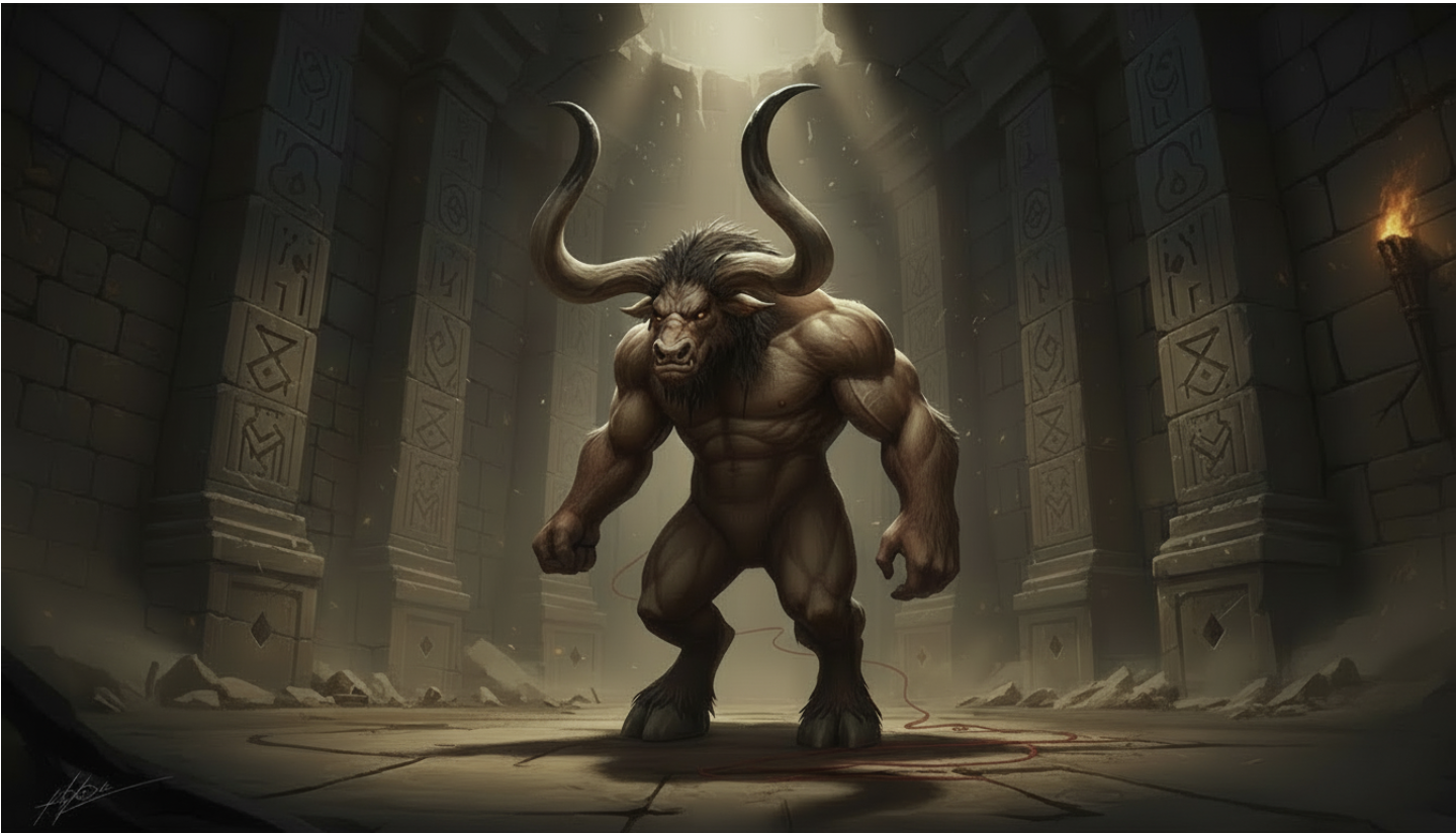 As punishment, Poseidon made Queen Pasiphaë (King Minos’ wife) fall in love with the bull. From this unnatural relationship, the minotaur, a half man, half bull creature, was born. Minos commissioned Daedalus, a brilliant inventor, to build the labyrinth, an inescapable maze beneath their palace in Knossos. This was done to imprison the minotaur, so it would never see daylight again.